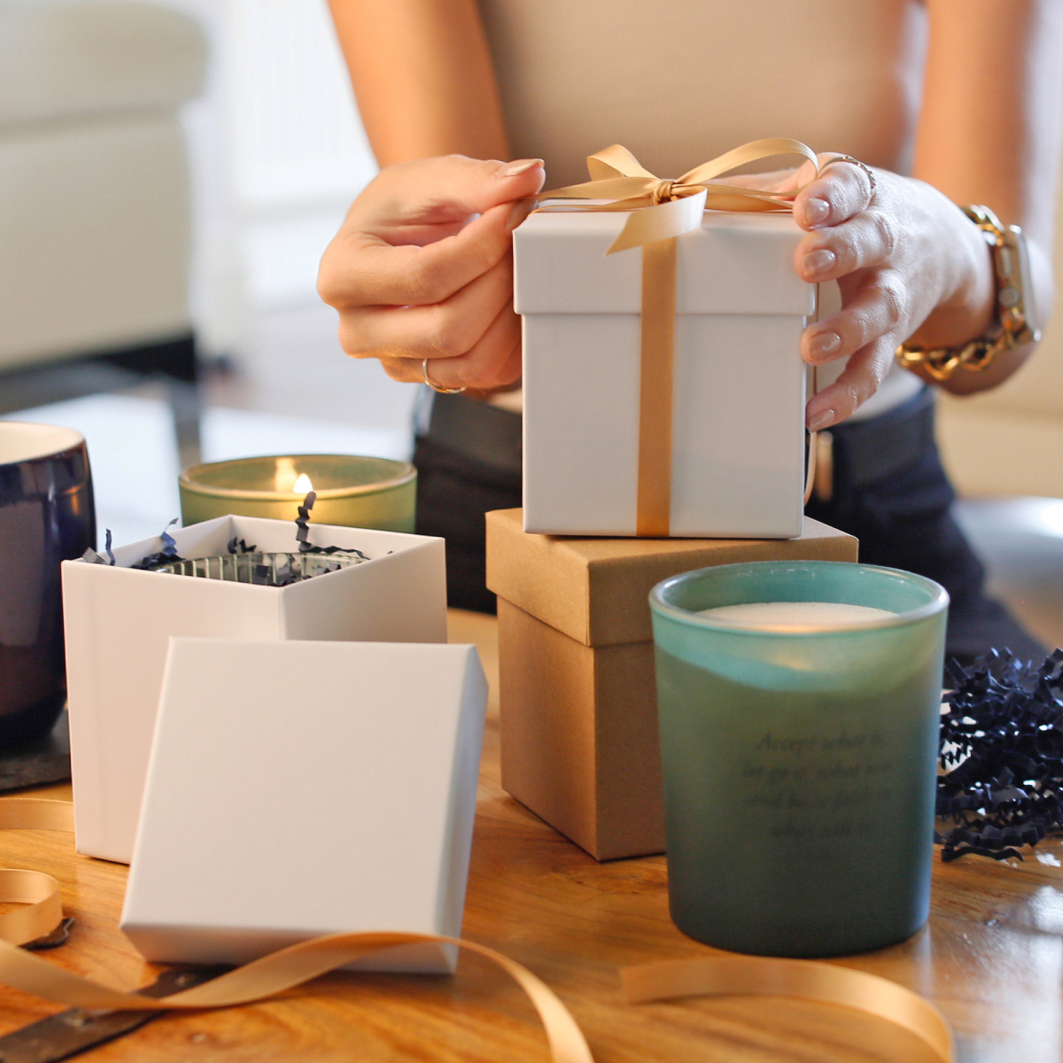 Bright tissue, ribbon, or coloured backdrops can bounce light onto boxes and distort the colour.